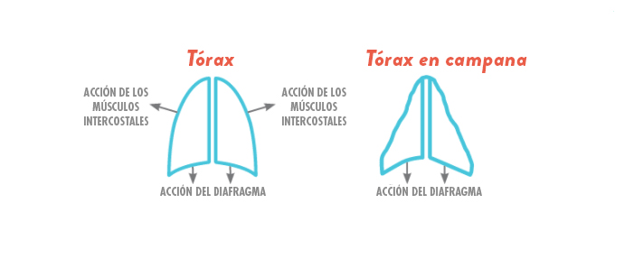 Tórax en forma de campana: Con la debilidad de los músculos intercostales y la respiración que se realiza principalmente por el diafragma, puede haber deformación del tórax en forma de campana.